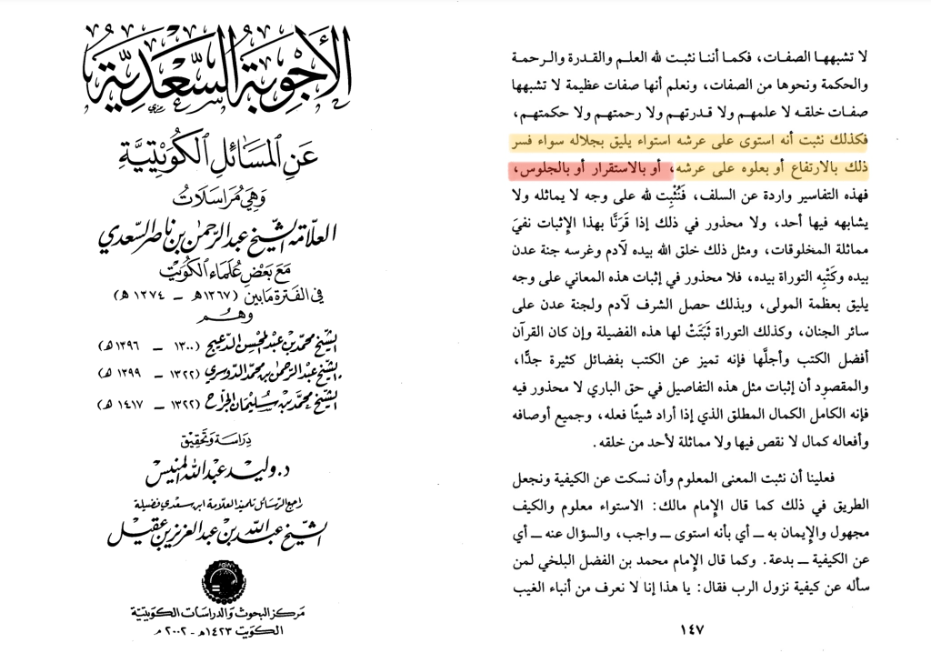 Abdul-Rahman al-Sa’di: الأجوبة السعدية عن المسائل الكويتية Pg: 147 Btw this is the same person who wrote Tafsir Al Sadi